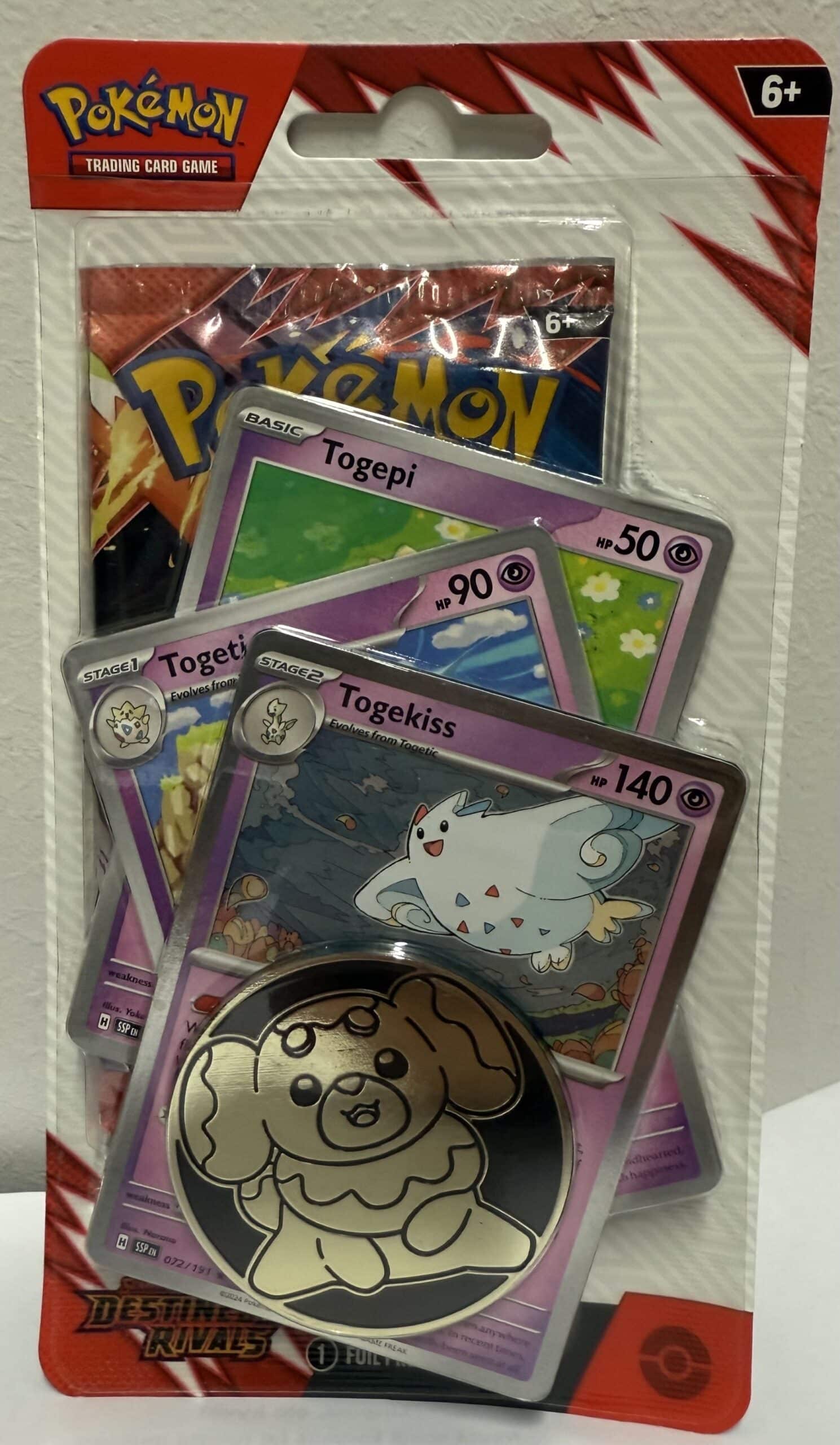 Pokémon Scarlet & Violet Destined Rivals boosteripakkaus. Pakkaus sisältää boosteripakan (sis. 10 korttia), yhden erikoiskortin, koodikortin online-peliin sekä Pokémon kolikon.