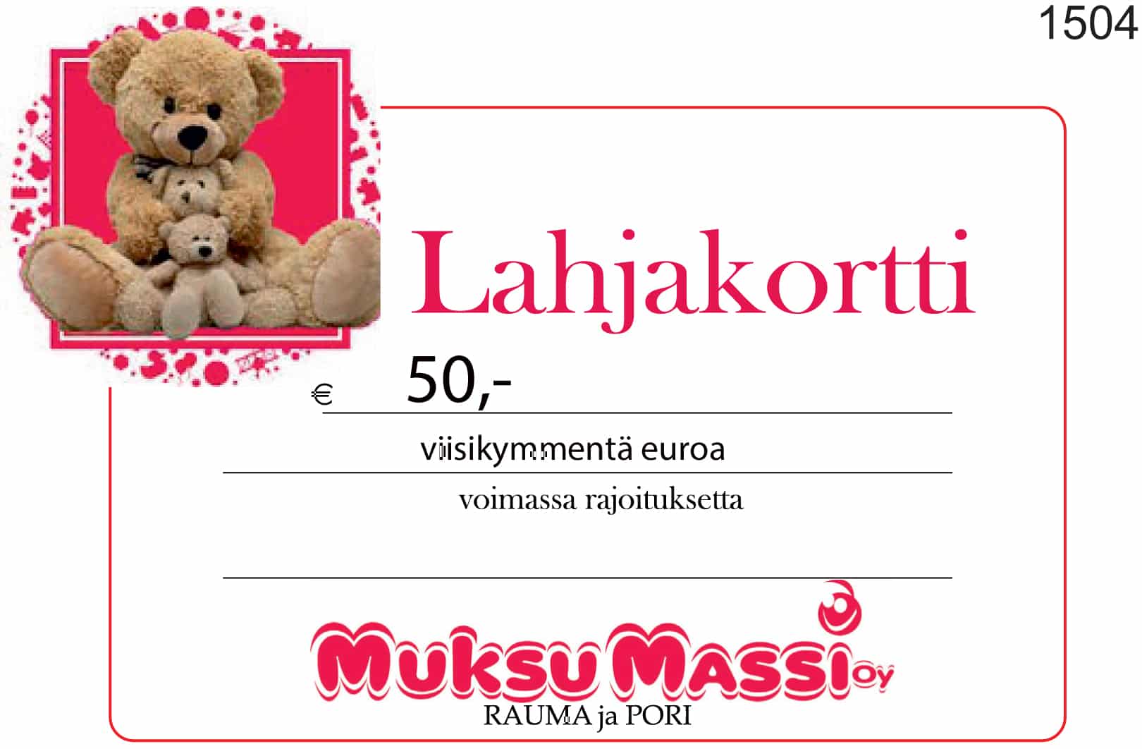 Tilaa lahjaksi Muksumassin lahjakortti, lahjakortti on voimassa 12kk ostopäivästä alkaen Rauman ja Porin myymälöissä.