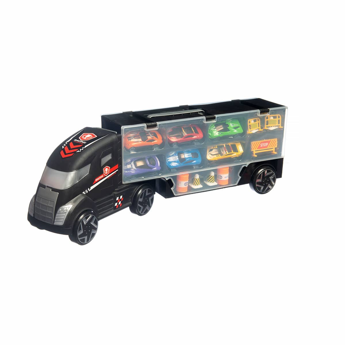 Upea Autonkuljetus Rekka lasten mukaviin leikkeihin! Pakkaus sisältää autonkuljetus rekan, 6 metalliautoa sekä tarvikkeita!