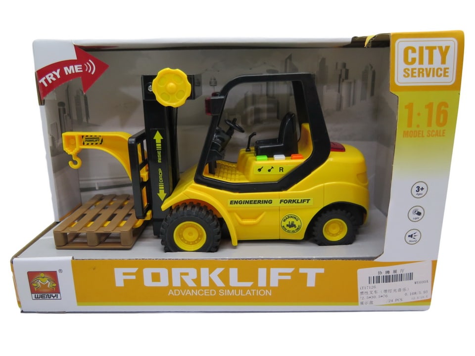 Trukki valoilla ja äänillä, sekä toimivalla nostomekanismilla. Trukin pituus 22 cm ja mittasuhde 1:16. Kulkee vauhtipyörämekanismilla. Paristot (3 x LR44) sisältyvät pakkaukseen. Ikäsuositus +3 v.