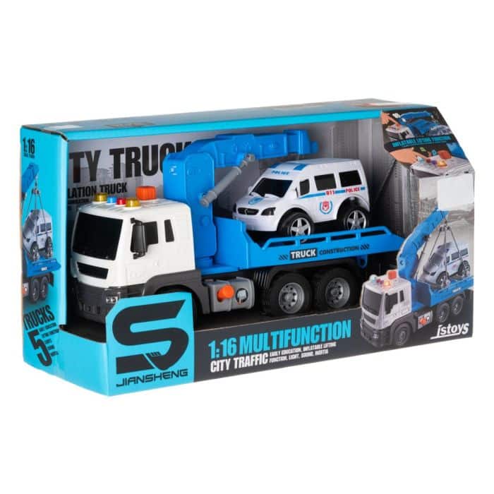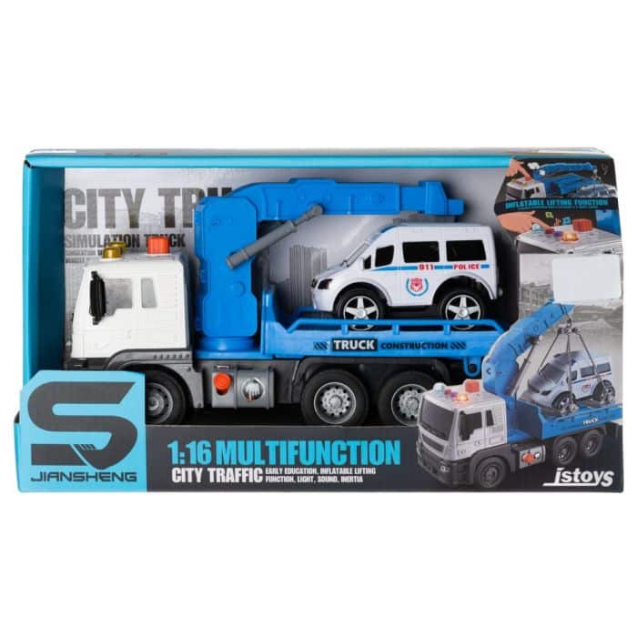 Viihdyttävä Istoys hinausauto. Nosta pikkuauto kyytiin nosturilla ja laske takaisin alas painamalla nappia. Valo- ja äänitoiminnot. Hinausauton  koko n. 26 cm