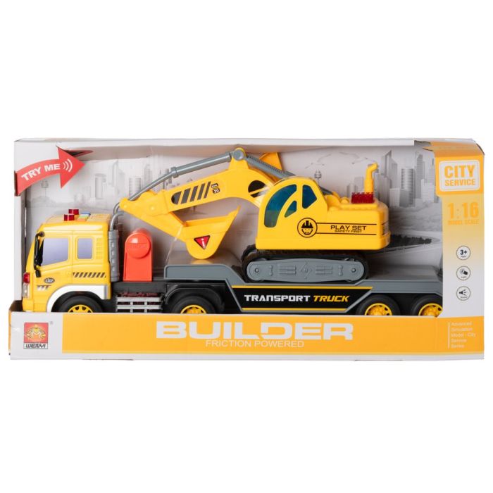 Hieno City service kuljetusrekka ja kaivuri. Kuljetusrekassa on kitkatoiminto sekä valo- ja äänitoiminnot. Kaivurin osat liikuvat. Rekan koko n 42cm/1:16.