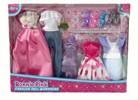Bonnie Pink vaate ja kenkäsetti sisältää viisi erilaista asua ja neljä paria erilaisia korkokenkiä. Soveltuu 30cm kokoiselle nukelle, barbielle.