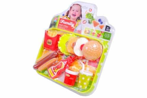 Hieno ruokasetti sisältää ranskalaisia, hampurilaisen täytteillä, hot dogin, ketsuppipullon, kastikepurkin, juomamukin ja tarjottimen.