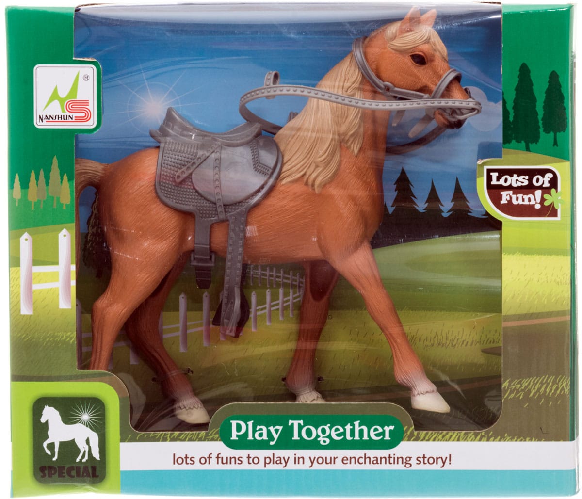 Upea hevonen, jolla mukana ratsastustarvikkeet. Hepalla voi ratsastaa noin 25cm pitkät nuket. Hevosen säkäkorkeus on noin 14cm. Ikäsuositus +3v.