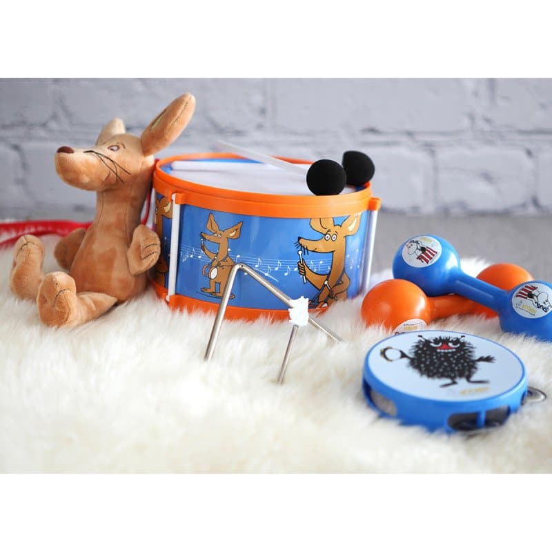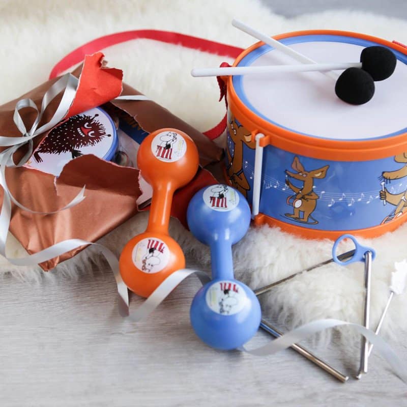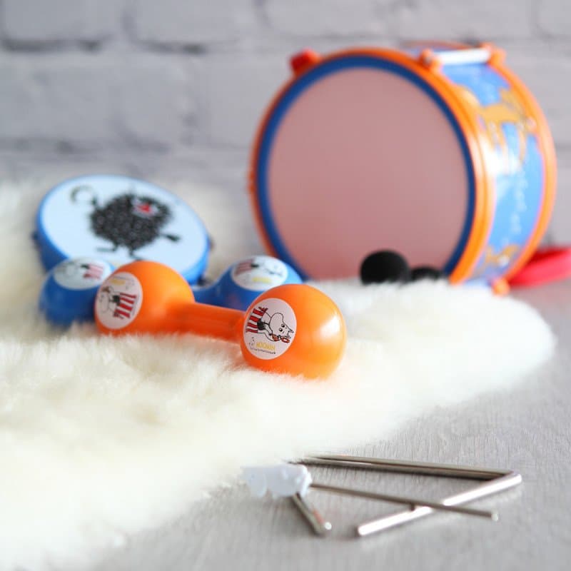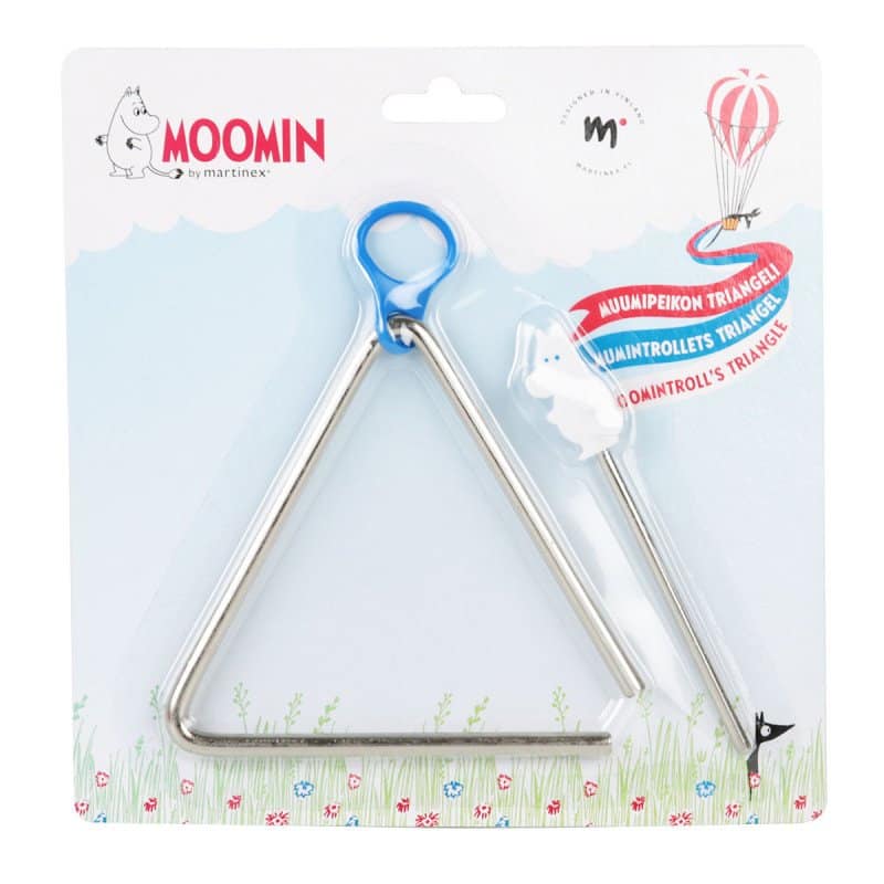 Pakkauksessa on triangeli ja soittotikku, jonka päässä on muumipeikkohahmo.