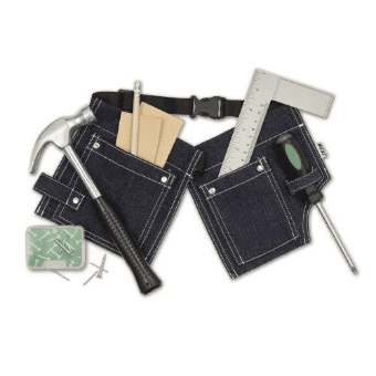 Micki työkaluvyö ja työkalut- setti sisältää lasten käteen soveltuvat vasaran, ruuvimeisselin, kulmakoukun, lyijykynän, hiekkapaperin ja ruuvi- ja naulapaketin – kaiken, mitä oikea pieni kirvesmies tarvitsee!
