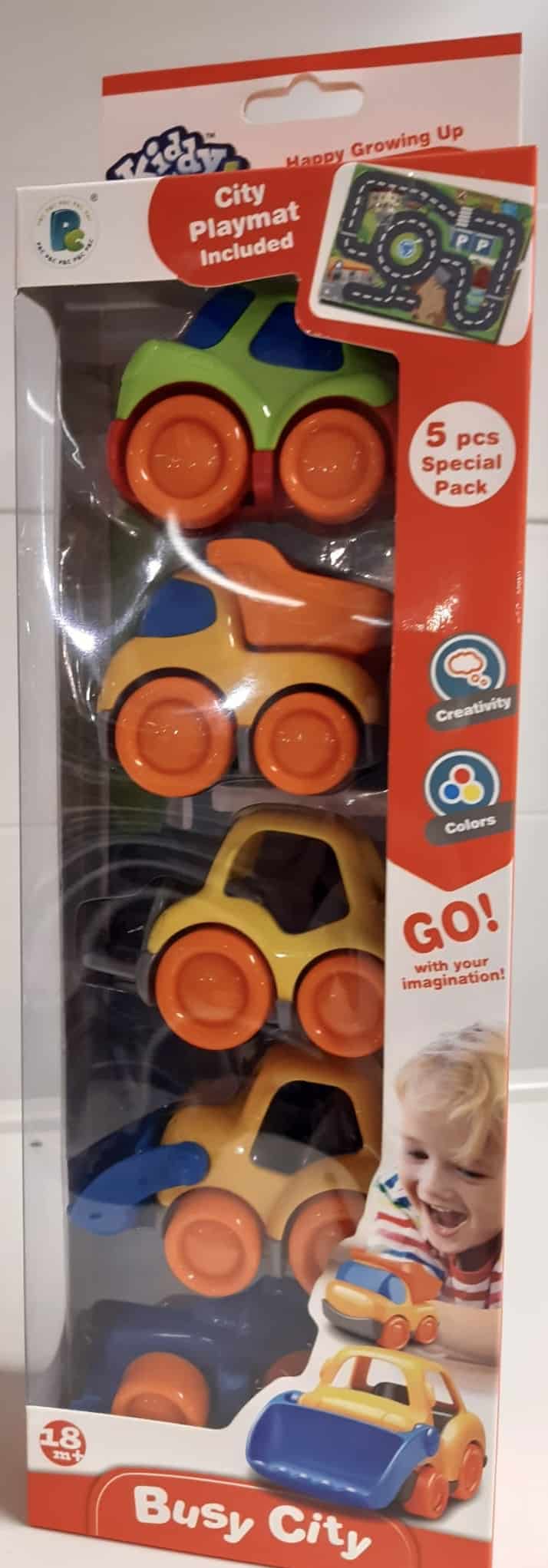 Hauskat muoviset Kiddy Go! Autot. Pakkaus sisältää 5 erilaista pikkuautoa ja pienen automaton. Autojen koko n. 7cm.