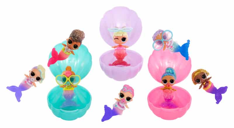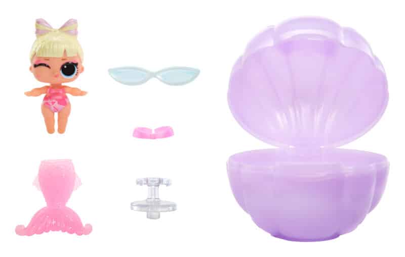 Merenneitoaiheinen L.O.L. Suprise Baby Sister nukke. Nuken pyrstö vaihtaa väriä vedessä. Saatavilla useita erilaisia.