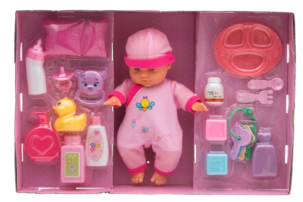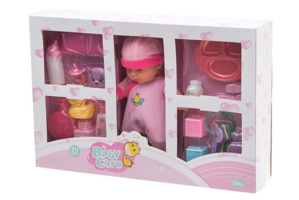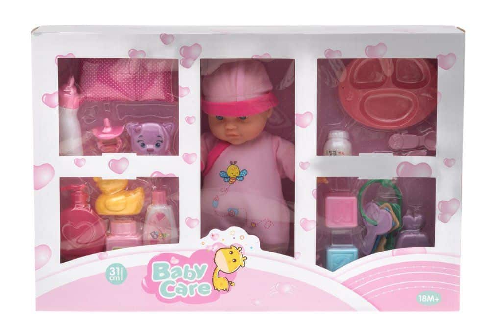 Ihastuttava leikkisetti sisältää kaiken tarpeellisen täydelliseen nukkeleikkiin. Setti sisältää välineet ruokailuun, kylpyyn, leikkiin ja nukkumiseen. Yhteensä 16 erilaista hoitotarviketta. Pakkauksessa mukana pehmeävartaloinen nukke 30 cm.
