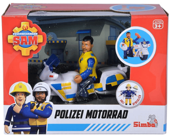 Palomies Sami -moottoripyörä, tarvikkeita ja Malcolm-poliisihahmo. Moottoripyörän pituus on noin 10 cm. Ikäsuositus +3 v.
