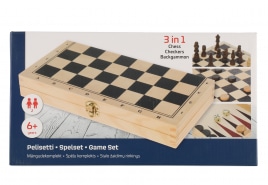 Puinen 3-in-1 pelisetti: shakki, tammi ja backgammon. Ohjeet FI-SV-EN-ET-LV-LT pakkauksen sisällä.