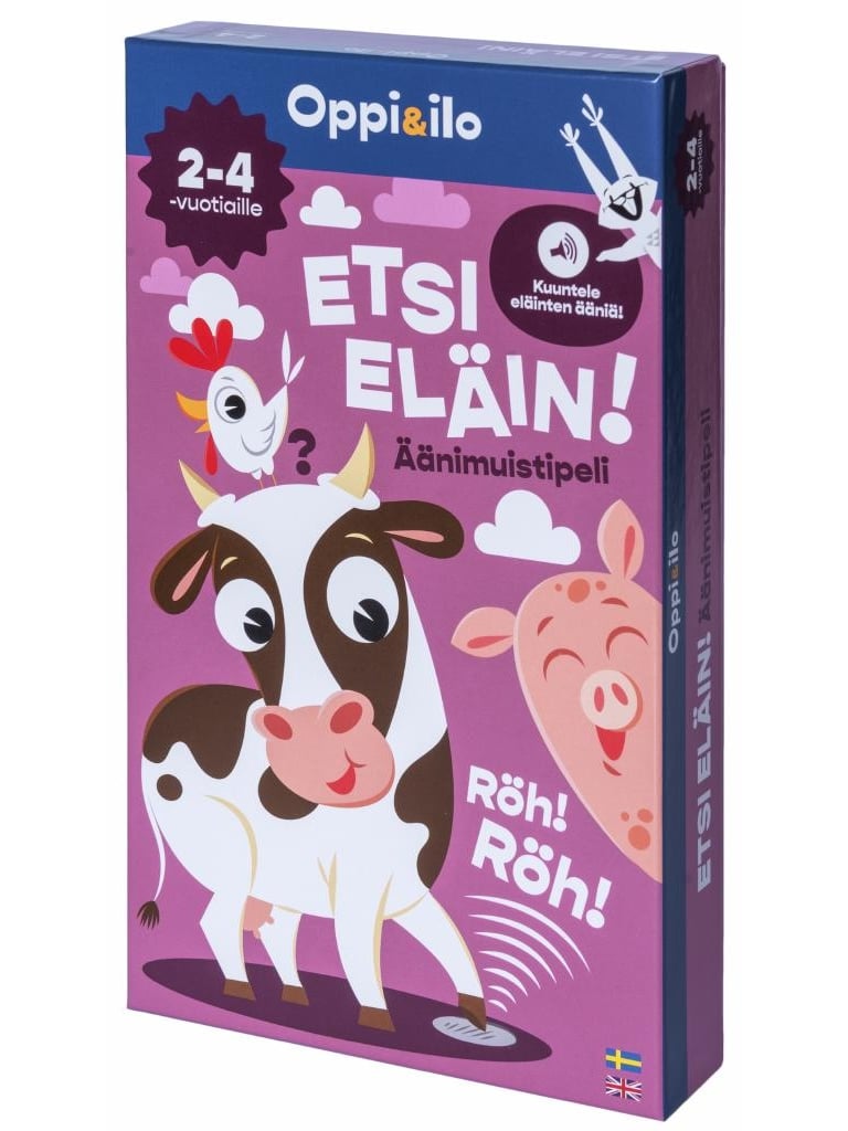 Oppi&ilo uudisti muistipelin eläinten äänillä! Ihastuttava lapsiperheiden suosikkituote! Röh-röh ja hau-hau – tunnistatko eläimen äänen? Onnistutko kääntämään ääntä vastaavan kuvakortin? Eläinten äänet riemastuttavat lapsia ja kuvaparin etsiminen tuo peliin jännitystä. Eläimet tulevat tutuiksi tässä uudenlaisessa muistipelissä, joka kehittää myös keskittymiskykyä ja vuorovaikutustaitoja. Kokeiluparistot (3 x LR1130) sisältyvät pakkaukseen. Ikäsuositus 2–4 v.