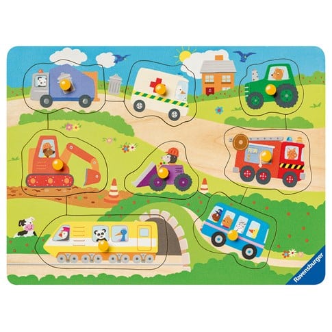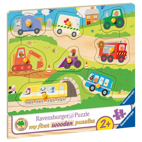 Ravensburger Ajoneuvot Puinen nuppipalapeli perheen pienemmille! Pakkaus sisältää 8 erilaista ajoneuvo- aiheista nuppipalapelin palaa.