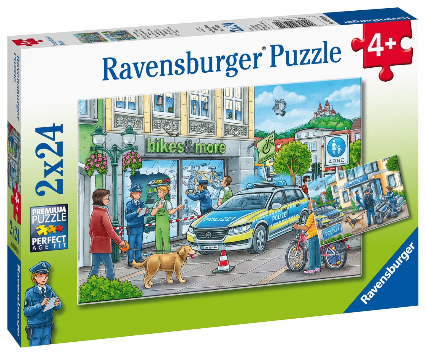 Upea Ravensburger palapeli poliisi -teemalla. Paketissa on kaksi palapeliä, molemmissa on 24 palaa. Yhden valmiiksi kootun palapelin koko on noin 26 x 18cm. Ikäsuositus +4v.