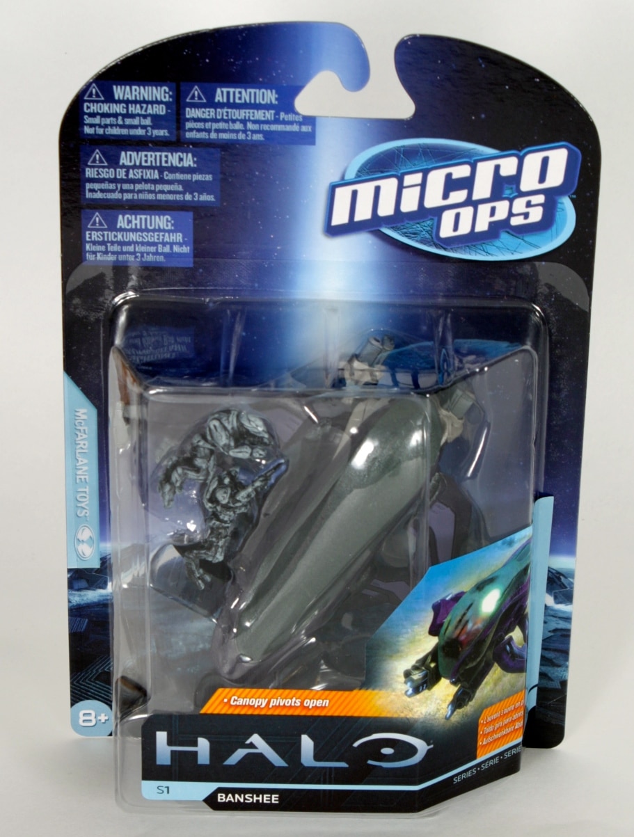 Halo Micro Ops Banshee avaruusalus. Pakkaus sisältää Banshee avaruusaluksen sekä 2 pientä hahmoa. Avaruusaluksen kansi avautuu. 4 erilaista pakkausta, kerää kaikki!
