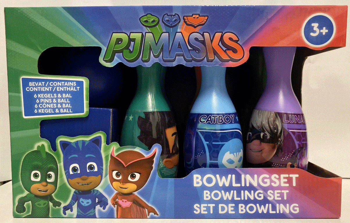 Hauska PJ Mask keilapeli. Sisältää 6 keilaa ja pallon.