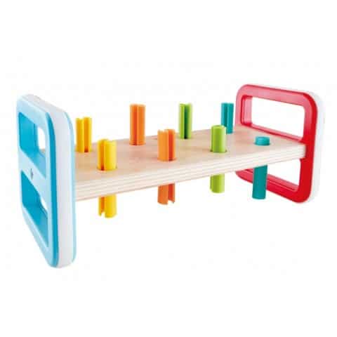 Mielettömän hieno hakka-lelu sopii yli vuoden ikäisille. Tämän hakan reunat ovat ääntä vaimentavaa kumia. Puisen vasaran pää on muovia. Ikäsuositus +1v.
