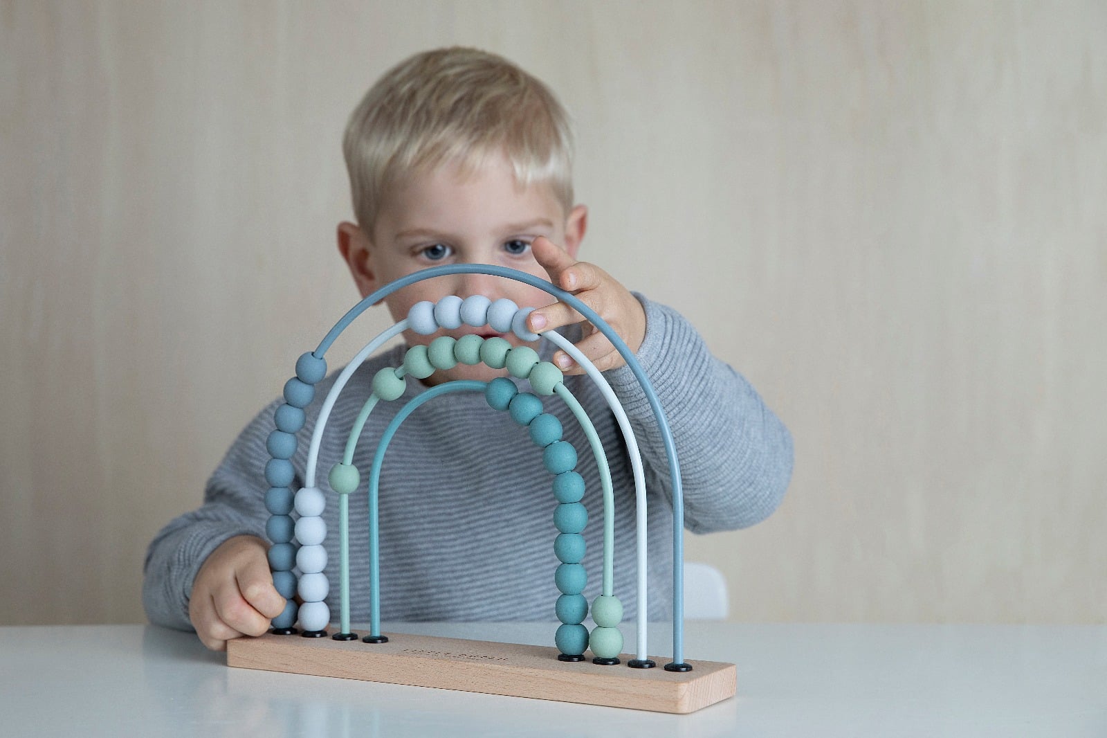 Upea Little Dutch Helmitaulu Sininen, jossa sateenkaaren värit. Lapsen on helppo opetella laskemisen alkeita helmitaulun avulla.