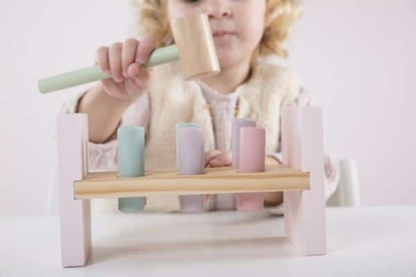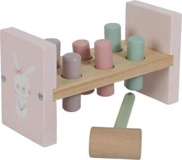 Upea Little Dutch vaaleanpunainen hakka on pienten lasten perinteinen lelu. Lapsi oppii nikkaroinnin perus asiat ja käyttämään vasaraa. Pakkauksessa mukana vasara sekä värilliset palikat ja alusta.
