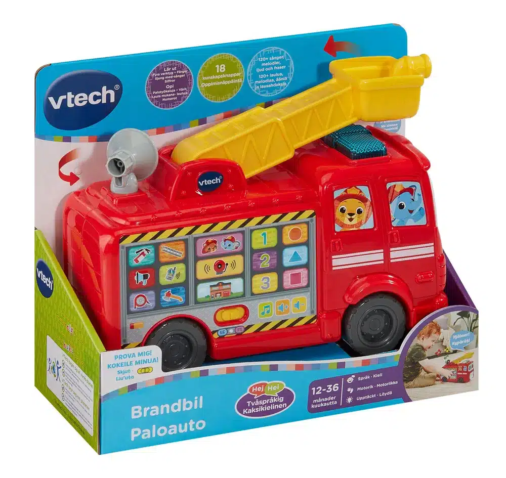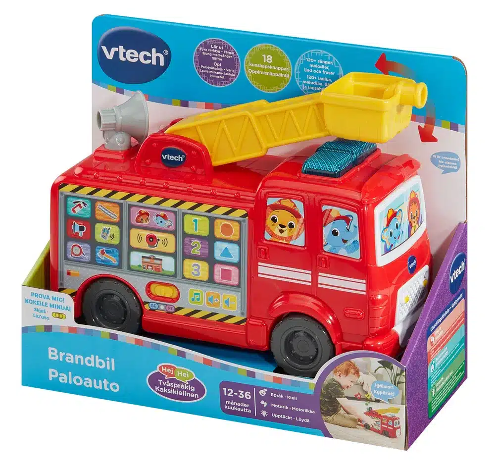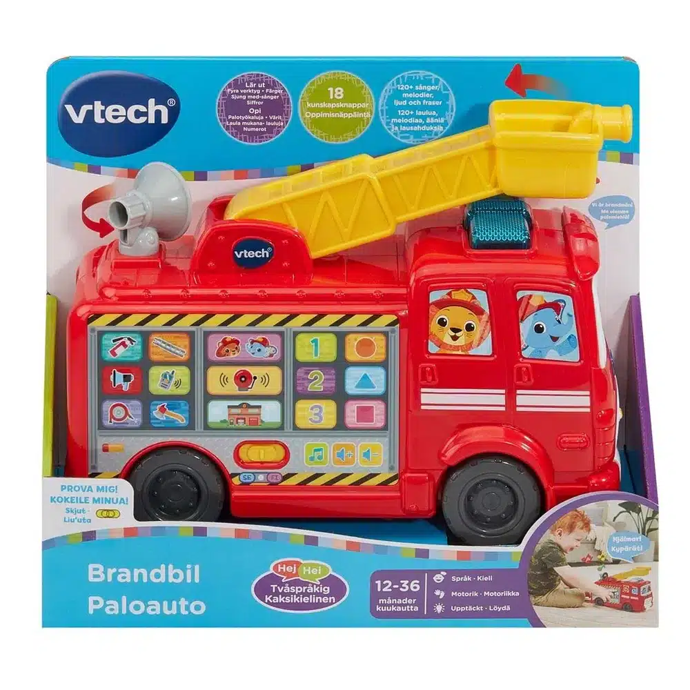 Upea VTech Paloauto! Paloautossa +120 laulua, melodiaa, ääntä ja lausahdusta. 18 oppimisnäppäintä. Opi palotyökaluja, värit, numerot ja laula mukana!