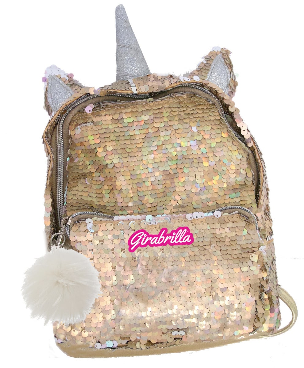 Upea paljettireppu, jossa yksisarvisen sarvi ja korvat. Repun korkeus noin 30cm. Ikäsuositus +6v.