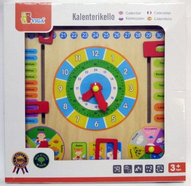 Tämän kalenterikellon avulla lapsi voi opetella kellonaikoja, vuosikalenteria, viikonpäiviä, säätä sekä muita päivittäisiä asioita. Kalenterikellon mitat ovat noin 30cm x 30cm. Ikäsuositus +3v.