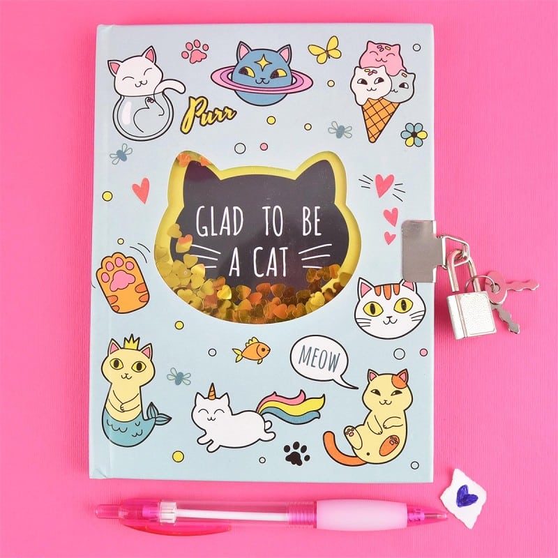 Ihana lukollinen kissa päiväkirja. Pakkaus sisätää päiväkirjan ja kuulakärkikynän. Päiväkirjan koko 18 x 13,5cm.