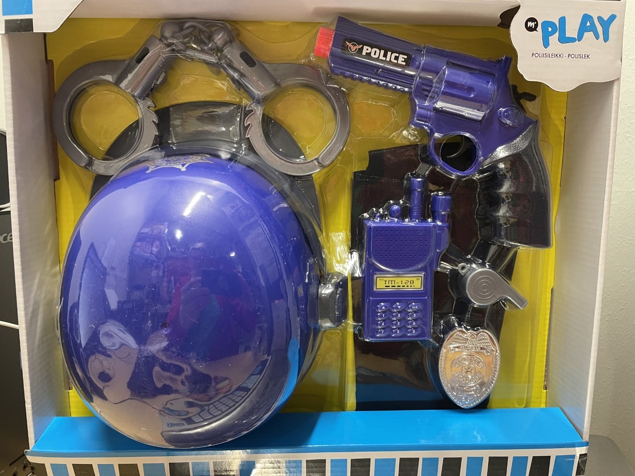 Poliisileikki Setti lasten roolileikkeihin! Pakkaus sisältää kypärän, liivin, pistoolin, poliisimerkin, käsiraudat ja avaimet, pillin sekä radiopuhelimen.