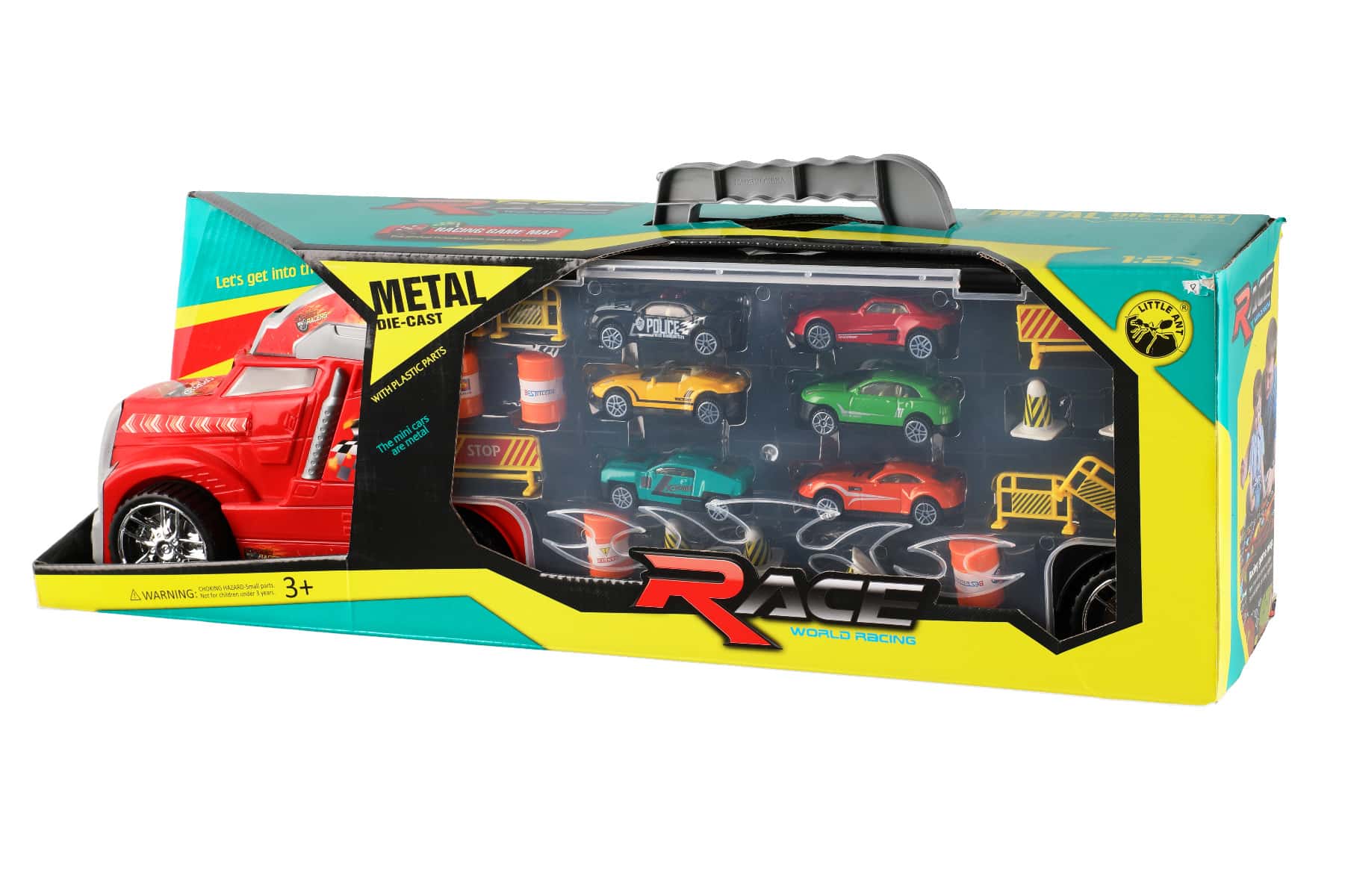 Sisältää rekan 54 cm x 17,5 cm, 6 kpl metallisia pikkuautoja sekä tarvikkeita. Toisella puolella tilaa lisäksi 12 pikkuautolle. Kätevä kantokahva. Ikäsuositus 3+.