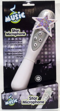 Upean mikrofonin voit liittää esim. älypuhelimeen ja laulaa mukana. MIkrofonissa on 3 valmista sävelmää sekä muita äänitoimintoja. Kokeiluparistot (3 x AAA) sisältyvät pakkaukseen. Ikäsuositus +3v.