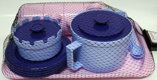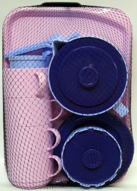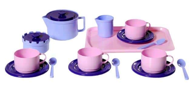 Plaston muovinen kahviastiasto neljälle. Pakkaus sisältää tarjottimen, neljä kahvikuppia, neljä aluslautasta, neljä lusikkaa, sokerikon, kermakon sekä kahvipannun. Ikäsuositus +3v.