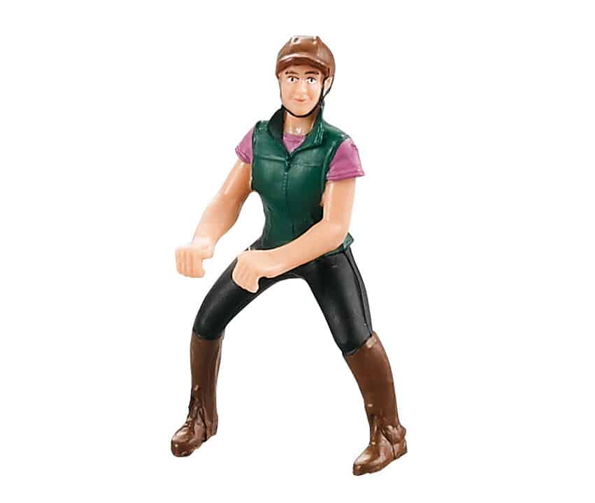 Horse Champion Ratsastaja pienille leikkihevosille. Tyttö, asusteena tummanvihreä liivi, mustat housut.