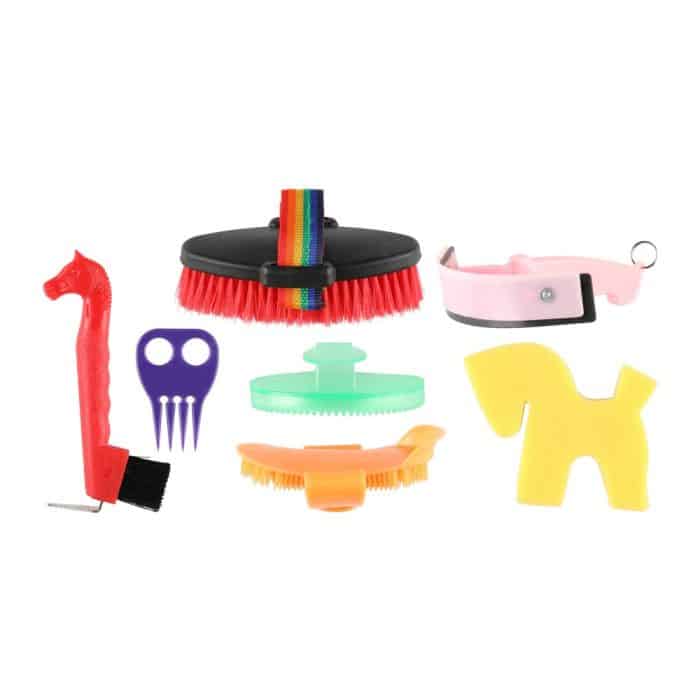 Keppihevosen hoitotarvike setissä harjoja ja tarvikkeita mitä tarvitset kun hoidat hevostasi. Yhteensä 7 osaa.